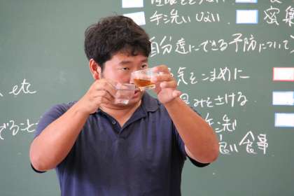 性感染症を防ぐ【3年保健体育】 公開日 2024/07/18 更新日 2024/07/18 3年生 3年生の保健体育では性感染症予防の授業を行っていました。麦茶の入ったコップを感染者に見立て、水だけ入ったコップが気づくと全て感染する様子が提示されました。感染症の恐ろしさだけでなく、防ぐための手立ても学んでいました。これからを生きる生徒たち自身が考え、感染防止ができる人になってほしいです。