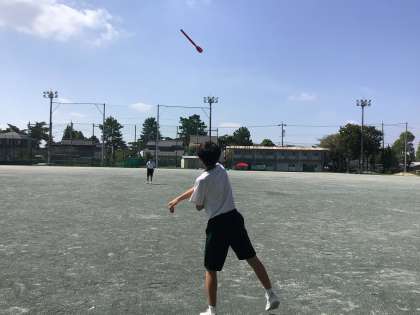 3年生の体育では、槍のような「ターボジャブ」を投げる「ジャベリックスロー」を行なっています。ボールのような球状のものと違い、棒状の「ターボジャブ」は横に傾きフラフラと舞い、安定してまっすぐ飛びません。教師が見本で投げると、青い空に綺麗な弧を描き、生徒からは「おぉ〜」と感嘆の声が聞こえました。生徒のターボジャブも空に綺麗な弧を描く日が楽しみです。