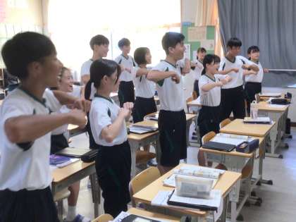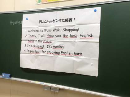 ワクワクショッピング?! 公開日 2024/09/18 更新日 2024/09/18 3年生 3年生の教室の前を通りがかると、何やら元気な声が… 教室を覗くと、生徒達が身振り手振りを使って、英文を練習していました。テレビショッピングのバイヤーになったつもりで、相手に買わせたいと思わせるために、どこを強調するのかみんなで考えながら話します。最後はみんな息がぴったりで、決めポーズもバッチリ決まっていました♪
