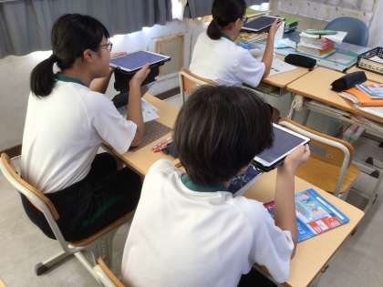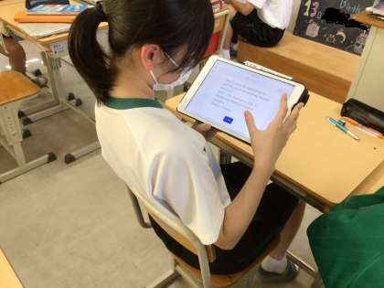 3年生の教室を覗くと、生徒たちがタブレットに向かって英文をつぶやいていました。