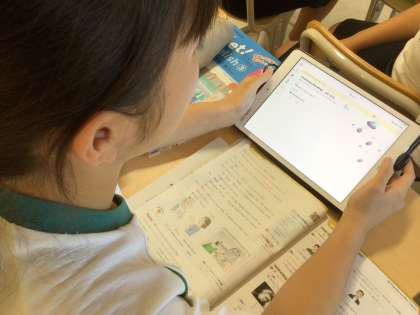 英文をタブレットで録音し提出すると、AIが採点をしてくれ、正しい発音ができているのかを採点してくれるそうです!生徒達はドキドキしながら自分が録音した英語を提出していました。