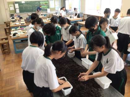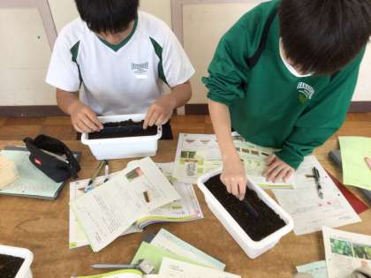 1年生の技術科では、秋・冬野菜の種まきが行われました。