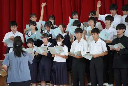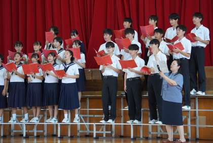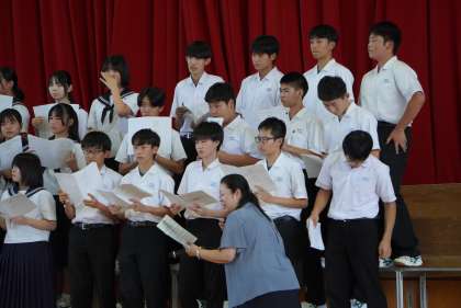 生徒に「歌っていて困っていること、よくしたいことはない?」と聞き、生徒の声に合わせて適切な指導を身振りをつけるなどしながらわかりやすく行っていただけました。時折見本で聞かせてくださる発声には、生徒たちからどよめきが起きるほど素晴らしい声でした。来週の合唱コンクールに向け、目標をもてたり、励みとなったりしたと思います。ありがとうございました。