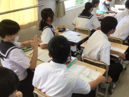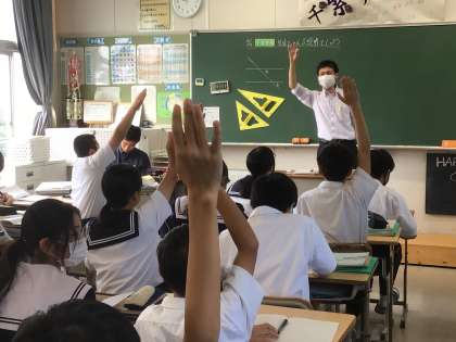 先生をこえる説明をしよう!【2年生数学科】 公開日 2024/10/25 更新日 2024/10/25 2年生 2年生の数学では、角と平行線の授業が行われていました。 「平行だとなぜ同位角は等しいのか、説明してみよう!」と、問われた生徒たちは頭をひねりながら考えます。近くの人と相談しながら、自分なりの仮説を立て、前に出て発表していました。 そんな考え方もあるんだ!と、新たな発見も多かったようです。どうでしょう、先生をこえる説明はできましたか?