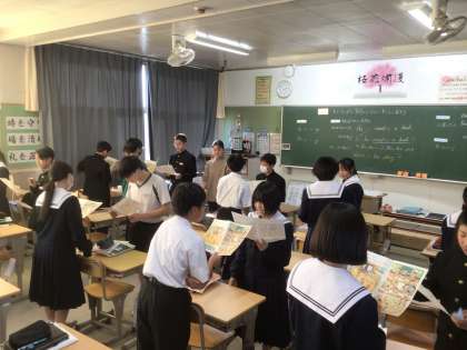 1年生の英語科では、現在進行形の疑問文の練習としてクイズ形式のゲームが行われていました。ペアになり、現在進行形の疑問文を使って質問をしていき、イラストの中のどの人物なのかを当てていきます。