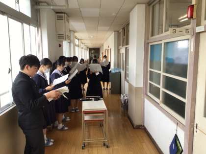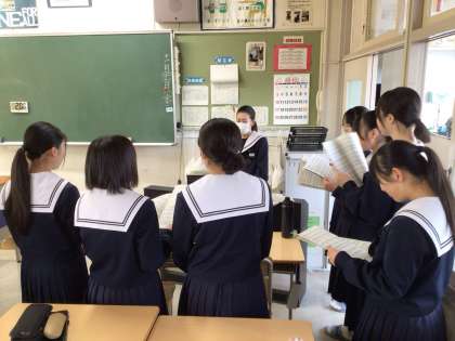卒業式に向けて 公開日 2024/11/27 更新日 2024/11/27 3年生 朝の台中タイムに、卒業式に向けての合唱練習が始まりました。冷たい朝の空気に、歌声がよく響きますね。文化祭での合唱練習を踏まえて、ピアノを使って1音ずつ音をとったり、CD音源を全員で聞いたりするなど、各クラスで工夫して練習をしています。