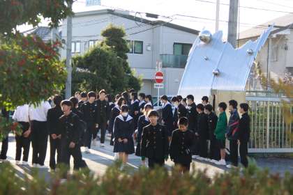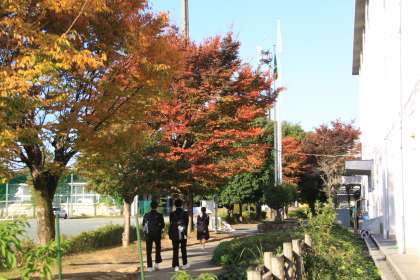 秋真っ盛り【朝の風景】 公開日 2024/11/28 更新日 2024/11/28 全校生徒 校舎前の「語らいの小道」のケヤキの木がすっかり赤くなってきました。朝登校する生徒たちの服装も寒さに備えた服装になってきました。校門であいさつ運動をする生活委員と一緒に、1年生の企画委員の生徒もCANペーンの一環で加わっています。今日も一日が始まります。