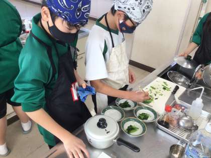 最近ぐっと寒くなってきました。そんな中、1年生の家庭科では、技術科で自分達で栽培した野菜(ほうれん草、小松菜、水菜、チンゲン菜)を使って、調理実習が行われていました。