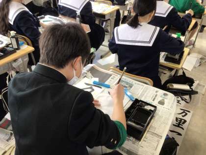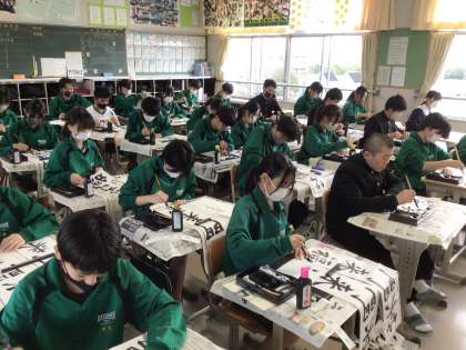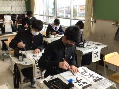 心を静めて【書き初め大会】 公開日 2025/01/07 更新日 2025/01/07 全校生徒 2025年。新年明けて、久々に級友に会い、話が盛り上がる放課。 2時間目になると気持ちを切り替え、静寂の中、書き初め大会が行われました。冬休みや今までの練習を思い出し、一文字一文字丁寧に書いていました。 渾身の作品が出来上がりましたか?