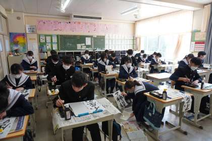 心を静めて(その2)【書き初め大会】 公開日 2025/01/07 更新日 2025/01/07 全校生徒 生徒が戻ってきた教室。それでも毎年のことながら、年の初めのこの時間はどの学級も静まり返った時間となっています。静かな中でも、学年が増すごとに落ち着き具合が高まっていきます。3年生はあと2か月もすると卒業です。2か月で人としてどこまでの成長を見せてくれるか楽しみです。