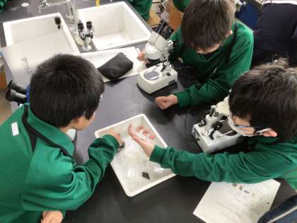 1年生の理科では鉱石の観察が行われていました。