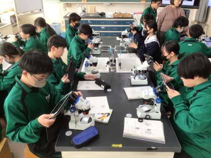 授業の前半では、石英やカンラン石など様々な鉱石を観察し、違いを感じていました。カンラン石を観察していた生徒達は「きれーい!」と言いながら、タブレットで写真を撮っている生徒もいました。