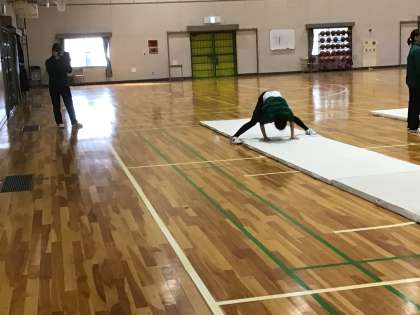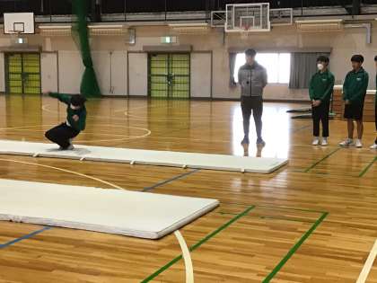 1年生からずっと行っているだけあり、3年生になると回転系の大技に挑戦している生徒もいました。教師からアドバイスを受け、技に成功しはじめる生徒達。