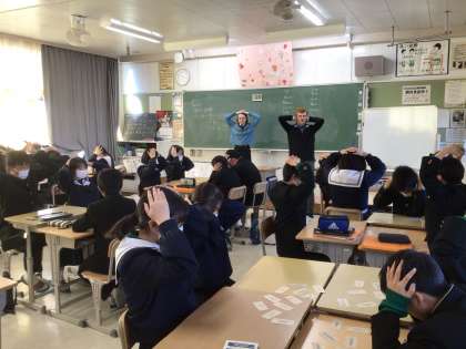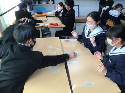 1年生の英語科では、ALTの教師とともに過去形の復習をカルタを使って楽しく復習していました。