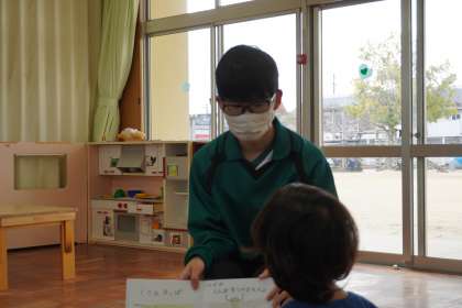 園児達に夏休み課題でつくった自作の絵本を使い、読み聞かせを行いました。生徒達は園長先生からいただいたアドバイス「目線を合わせる ゆっくりと読む」を心がけて絵本を読みました。園児のみんなに楽しんでもらえて嬉しかったです。