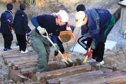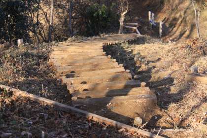 土を運び、打ち込んだ間伐材の段に土を入れて階段を新しくしました。これまでの階段は12年前に作り、木が朽ち始めていました。新しくなり、やはり山が登りやすくなりました。