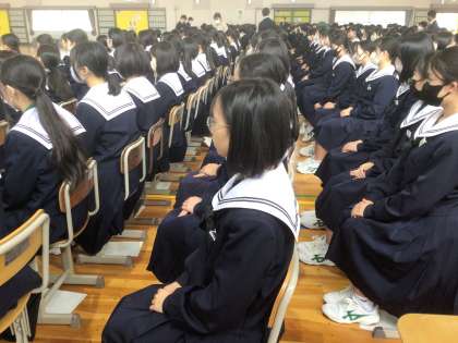 卒業式の意義やそれに向かう姿勢について2年生学年主任から話がありました。椅子の座り方から礼、拍手の仕方、身だしなみ、合唱練習と、あっという間の1時間でした。