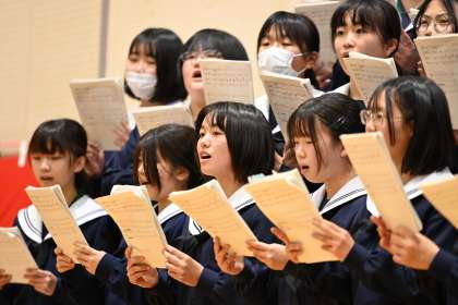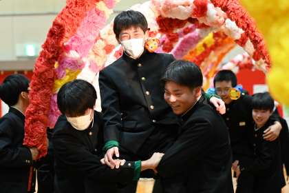 卒業生を送る会(その1) 公開日 2025/03/05 更新日 2025/03/05 全校生徒 3年生の卒業を前に、1,2年生から3年間を振り返ってもらおうと「卒業生を送る会」が開かれました。3年生の入場から笑顔があふれる会が始まりました。体育祭で行ったクラスアピールや合唱コンクールの歌。思い出を深堀するコントや映像で3年生への感謝の思いを伝えていました。
