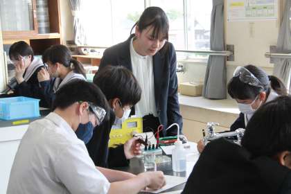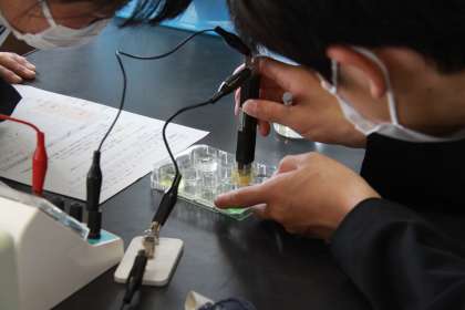 3年生理科では様々な液体の中で、電気を通すものと通さないものを実験で確認していました。今回の実験では、食塩水、塩酸、硫酸銅が通電しました。実験後、なぜその液体が電気を通すのかを考察していました。次回の授業までに理由がわかるでしょうか?