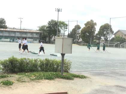 運動場ではブラシやレイキで運動場を整然と整備する姿が見られました。黙々と作業を進める姿は格好いいです。