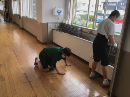 最近風が強く、校内の床には薄らと砂が見られます。床掃除と手洗い場の掃除に頑張って取り組む3年生の姿に惹かれました。
