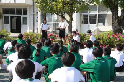 体育祭に向けて心をつなぐ【団結団式】 公開日 2025/04/30 更新日 2025/04/30 各種行事 ゴールデンウィークの狭間。体育祭日課が始まりました。今日は縦割りの団活動のつながりを強くする「結団式」が行われました。3年生の団長から決意が語られ、気持ちを高めていました。つながりを強くするレクリエーションも行われました。ここから約2週間、体育祭に向けて、熱く盛り上がっていきます。