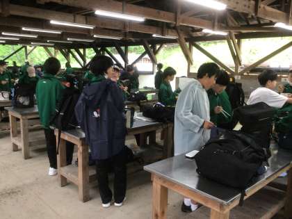 オリエンテーリング中に、班でまとまって、お弁当を食べる時間を作っています。キャンプファイヤーや調理を行うファミリーサイトに多くの班が集まって、お弁当をいただいています。