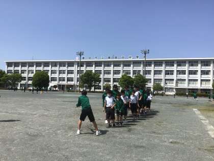 1年生と2年生の一部のクラスが運動場で体育祭の練習をしていました。長縄跳びの練習をしているクラスに誘われて参加しました。クラス最高記録は3回と聞いていましたが一緒に記録を更新し、9回跳ぶことができました。その隣では、回し手を特訓しているクラスがありました。それぞれの戦術があるようです。
