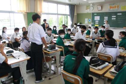 未来の教育を担う教師の卵 公開日 2025/05/30 更新日 2025/05/30 校長室から 先週から始まった教育実習。今日は実習生の研究授業が行われました。指導教官から受けた指導の下、2人とも立派に授業を行っていました。生徒たちも実習生に応えようと頑張って授業に取り組んでいました。次世代の教育を担う教員が育っています!
