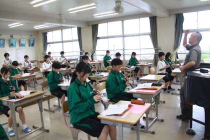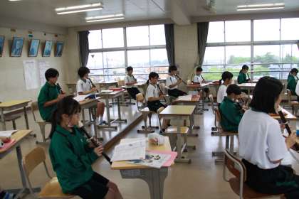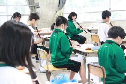 音は姿勢から【1年生音楽】 公開日 2025/06/10 更新日 2025/06/10 2年生 中学校の音楽科では、アルトリコーダーを使っています。小学校まで使っていたソプラノリコーダーより一回り大きくなっています。1年生は音の出し方を丁寧に教わっています。足をしっかり床につけ、背筋を伸ばすこと。リコーダーに吹き込む息をどのように吹き込んだらいいのか。教わった方法で吹くと生徒から、「音が変わった!」と驚く声も聞こえます。基礎を学ぶことの大切さを見ることができました。