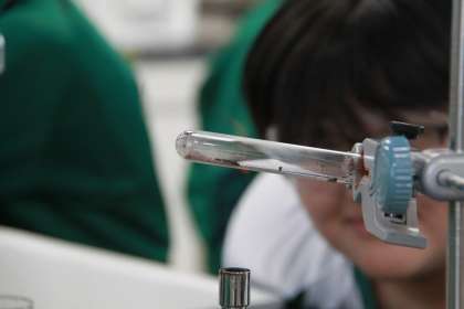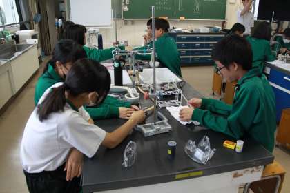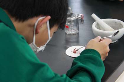 2年生が酸化銅を還元し、銅と酸素に分ける実験を行っていました。理科の実験は変化が目の前で起こるので、生徒はいつも夢中になって取り組む姿が見られます。(炭も混ぜているので)真っ黒だった酸化銅を試験管に入れ、ガスバーナーで熱していくと、次第に色が赤く赤銅色になっていきます。うまくいったグループは、銅が輝くまで変化しました。