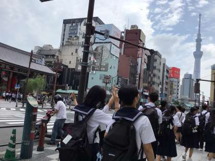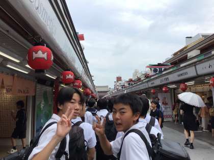 学級別研修 3組 浅草 公開日 2025/06/12 更新日 2025/06/12 3年生 雷門の前の通りは多くの観光客でにぎわい、浅草ならではの活気を感じることができました。通りの先にはスカイツリーも見え、歴史と現代が融合した風景を楽しむこともできました。今から仲見世通りを班ごとに分かれて散策します。
