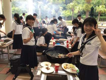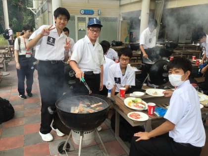 イルカペンギンショーを観て、バーベキュー会場に来ました。班に分かれて、炭で焼き始めました。野菜や牛肉、豚肉、鶏肉などの肉類が食べ放題、ジュースも飲み放題です。焼き担当のトング捌きは慣れています。