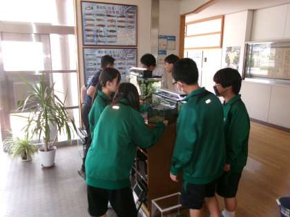 地域コーディネーターが紹介してくださった、地域の魚とり名人さんから台中玄関に、矢作川に生息する魚などを再び入れていただけました。今回の魚は今までのカワムツに加え、ヨシノボリ、ホトケドジョウ(絶滅危惧種)、テナガエビなどがメインの水槽に入り、さらに今までいたイシガメに加え、クサガメ、ミシシッピアカミミガメ(外来種)、スッポンまでいます。(スッポンは砂に潜るのでなかなか見つけられません)休み時間には、生徒も集まり、かなりにぎやかな様子となっています。学校にお寄りの際はぜひ見ていってください。