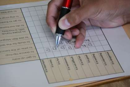 2年生教室からALTの明瞭な英語の指示が流れていました。内容はゲームの説明でした。縦と横に示された二つの英文をつないで「It's○○to原型」の文を作り、声に出して読むと、マスが取れます。先に4つマークをつなぐとポイントになるルールです。さて、どちらがたくさんのポイントを稼げるでしょうか?