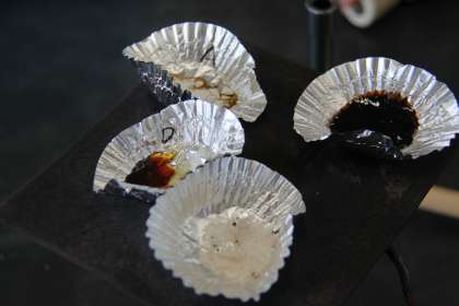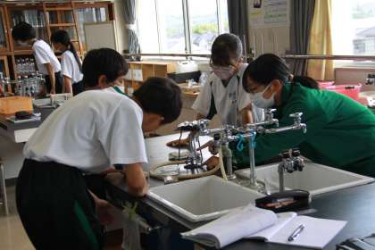 理科室の甘い匂いに誘われてい見れば、生徒たちが、ガスバーナーで白い粉をあぶっていました。その変化の様子から粉の正体を探っていました。4つ並んだ白い粉。正体は何だろう?
