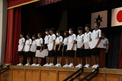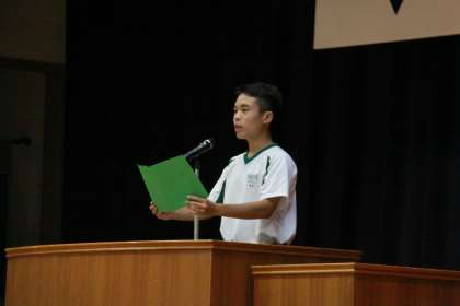 集会では、夏の大会等の表彰や代表生徒の意見発表が行われました。意見発表では、3年間取り組んだ部活動での成長から、今後、部活動以外の勉強や学校生活でも粘り強く取り組んでいける力がついたことを話してくれました。