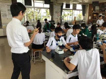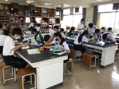 夏休み中は雨が降らず、校地の枯れた植物もありました。植物と水の関係を追究する授業を2年生理科で実践していました。トウモロコシを観察している生徒もいました。ひとり1台ずつ顕微鏡がありますので、植物の茎や葉を自分で切断し、観察をしていました。事前に色水を吸わせているので、水の通り道がはっきりと見ることができました。