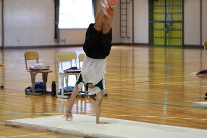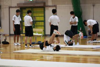 スポーツの秋!【3年生保健体育】 公開日 2025/09/30 更新日 2025/09/30 3年生 3年生の体育はマット運動です。派手な跳躍を加えた技から丁寧な回転技まで、生徒の技量に合わせた練習をしていました。学習用タブレットで動画を撮影したり、体を支えあったりして個々の技量の向上に努めていました。