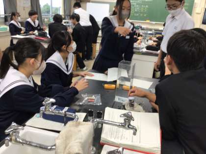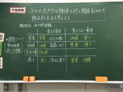 浮力に影響するのは?(3年生理科) 公開日 2025/11/05 更新日 2025/11/05 3年生 水に物体が浮くのは浮力が働くからです。巨大で重たい船も浮いて沈みません。何が影響したら物は浮くのか?質量、体積、深さ何が変化すると浮力は変わるのか?それを検証するための実験方法を生徒たちが考えています。どんな実験を考え、答えに辿り着くのか楽しみです。