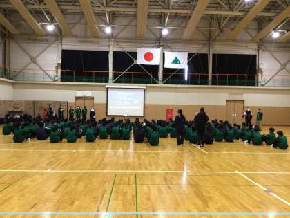 高山市街地を抜け目的地に到着しました。バスから荷物を運び、現在は体育館に集まっています。準備ができましたら入所式を始めます。