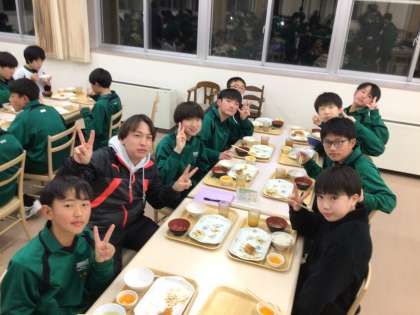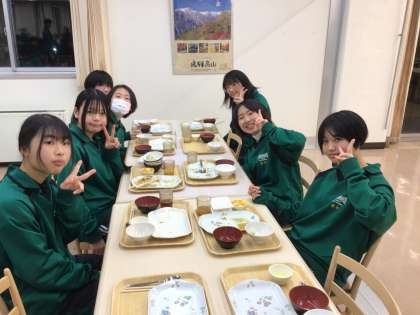 楽しみにしていた夕食バイキングの時間です。中学生の好きそうなメニューがたくさんあり、それぞれ食べられる量を取り、いただいています。