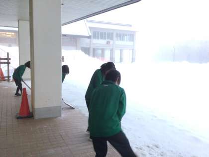 7時10分から掃除が始まりました。交流の家の玄関の様子です。外はマイナス6度の表示が出ています。薄っすらと新雪が積もりました。