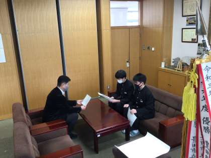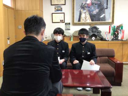 生徒会前期後期会長が校長室を訪ねてくれました。前期後期生徒会役員が発案し、全校生徒から意見を取り上げ、6箇条の宣言文にまとめています。個性の尊重や協力、いじめの撲滅を宣言します。宣言文制定の経緯や今後の台中への期待を直接話してくれました。全校生徒に宣言文を披露する日が楽しみです。