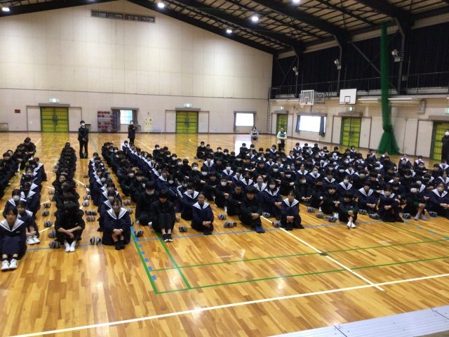 早朝の体育館に1・2年生が集まりました。卒業生を送る会に向けての説明が、2年生実行委員よりありました。3年生が3年間の思い出を振り返り楽しい時間が過ごせるよう、様々なスタッフが分担して取り組みます。実行委員より「2年生は1年生を引っ張る、1年生は2年生に負けない熱量で」と取り組む姿勢を期待されました。3月3日の会当日まで、スタッフの皆さん、活動頑張りましょう。