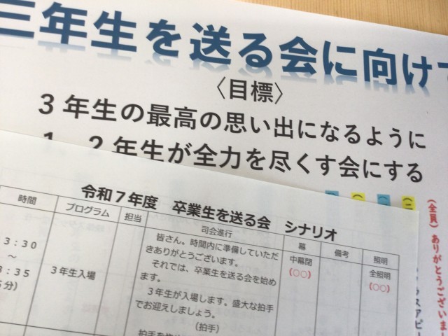 先輩達に想いよ届け!(卒業を祝う会スタッフ会) 公開日 2026/02/17 更新日 2026/02/17 各種行事 朝の決起集会に続き、先輩の下校後、卒業を祝う会スタッフ会が行われました。黙々と装飾やメッセージカードを作るスタッフや、楽しませようとアイデアを練るスタッフとさまざまでしたが、どの部屋をのぞいても感謝の思いを伝えたい雰囲気に包まれていました。想いが届く、3月3日の当日が楽しみです。 +2