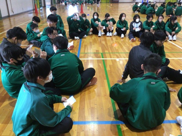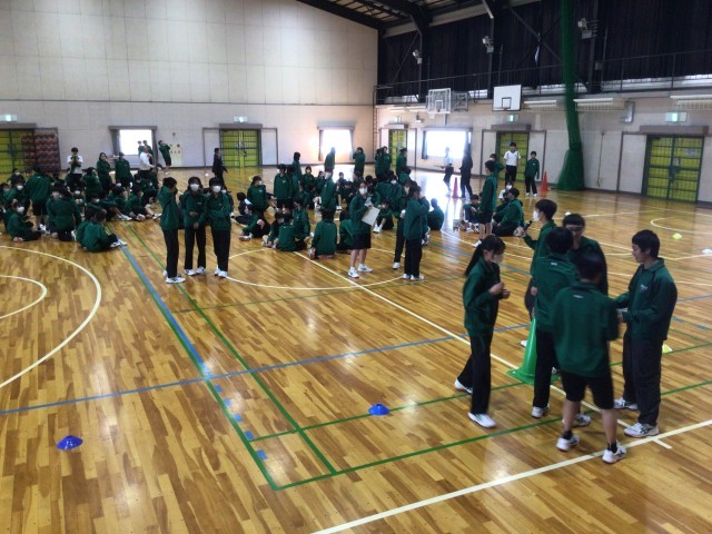 体育館で2年生が学年レクを行っていました。企画運営を生徒が行い、楽しく進めていました。借物リレーなどクラス対抗の競技で、最後のレクの時間を学年で楽しく過ごしていました。