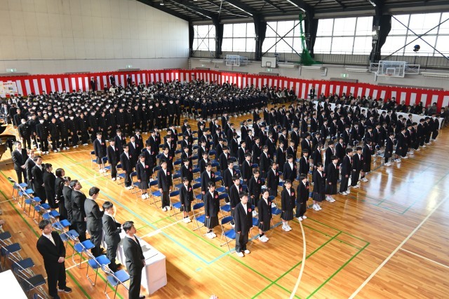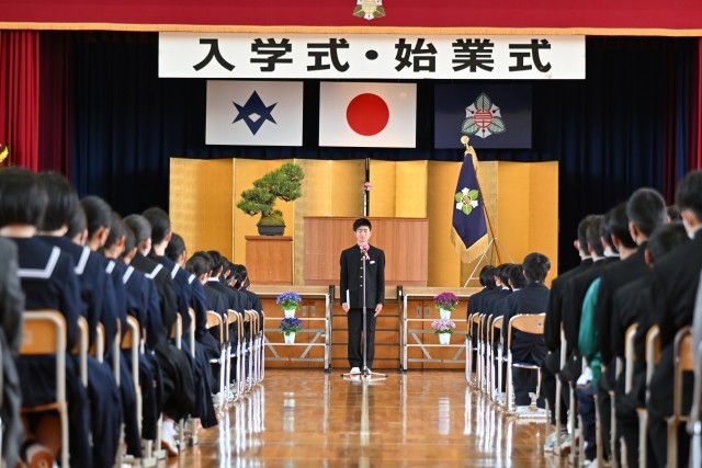 4月9日、多くの来賓と新入生保護者の皆様にご参加いただき、令和8年度入学式・始業式を行うことができました。生徒会長の歓迎の言葉は温かく、新入生代表の誓いの言葉は力強く述べられました。校長からは、新入生を歓迎する気持ちと今年度のスローガン「ちがいを力に、心をひとつに」について話をしました。