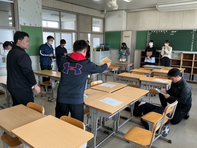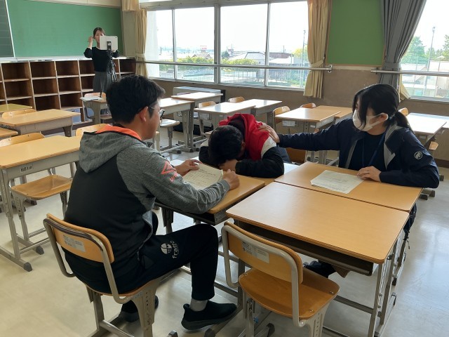 新学期が始まる前に、アレルギー対応訓練を行いました。給食後にアレルギー反応が出た生徒を教職員が連携して救助します。AEDを活用した救急救命講習は、毎年生徒も受講しています。