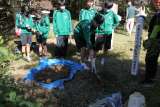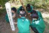 植樹をする生徒の様子です。造園屋さんに肥料の大切さや、根付くまでの水やりの大切...
